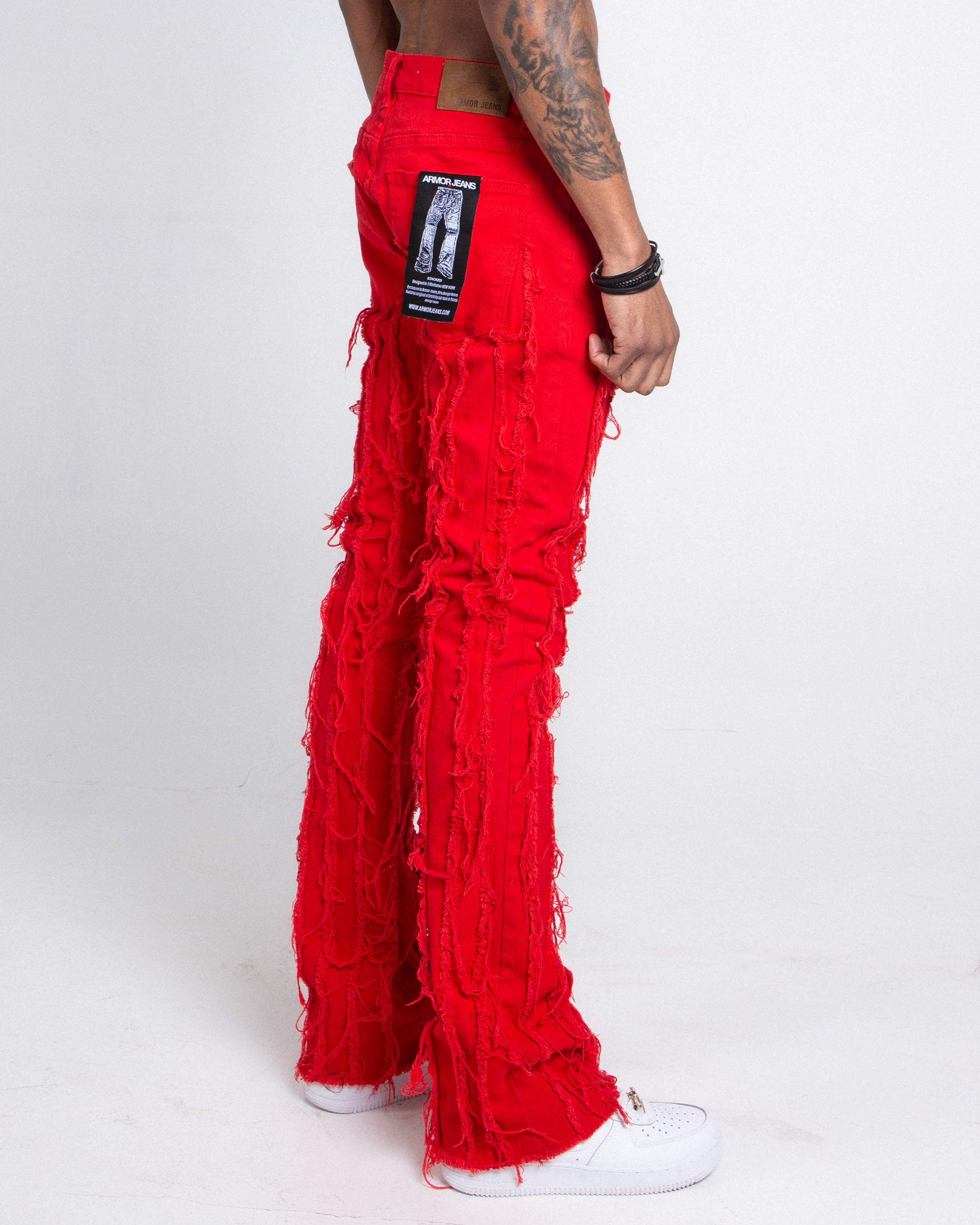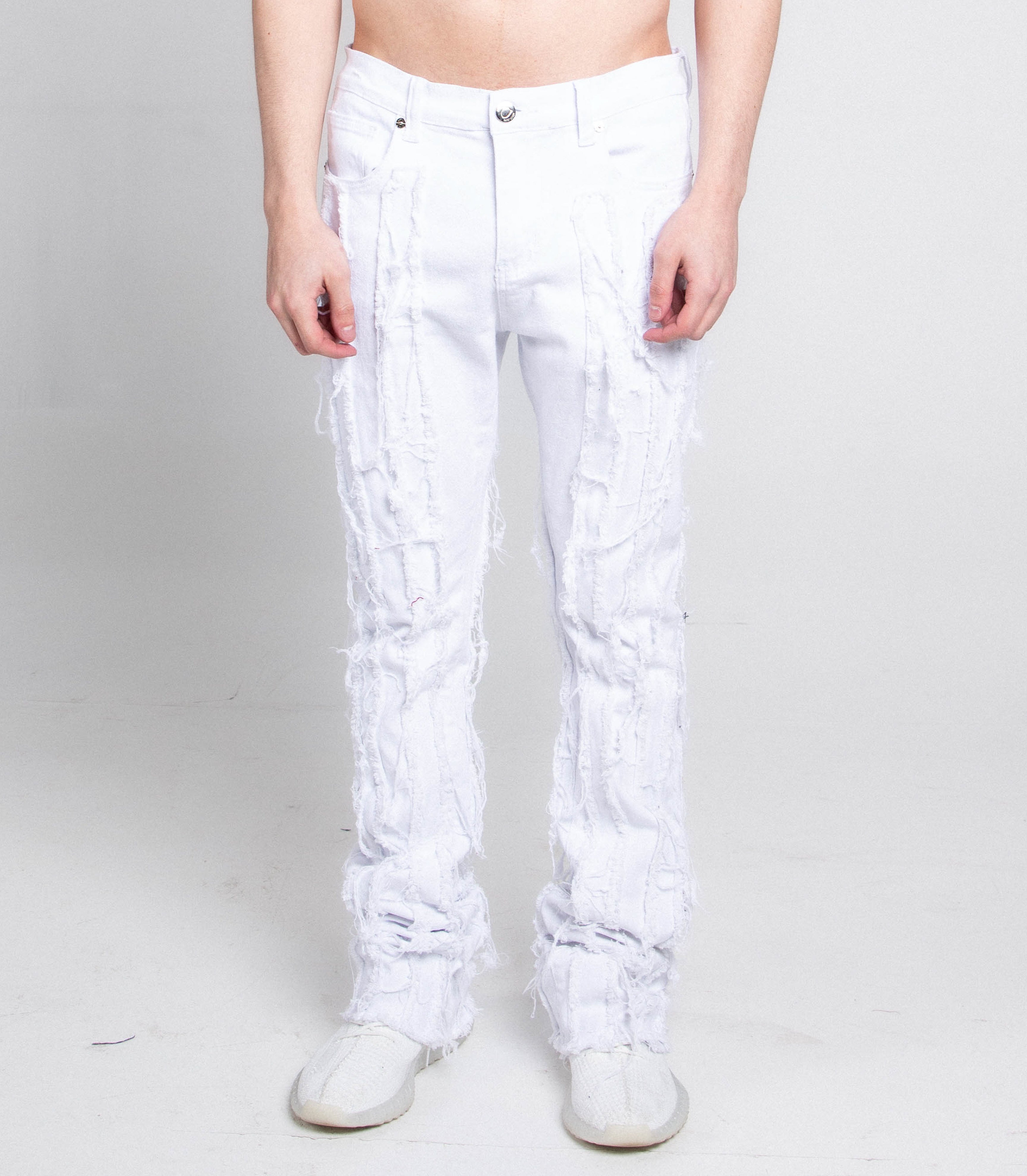 Color block stacked leg jeans with a five-pocket design, belt loops, and a zipper fly and top button fastening. Made from cotton.