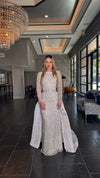The Aleena Bridal Embellished Pearl Crystal Beaded Gown With Detachable Overskirt is a stunning gown adorned with exquisite pearl and crystal sequin beadwork, ensuring you shine with every step. Perfect for making a grand entrance for your Big day as a bride to be, this dress combines timeless elegance with modern sophistication.
