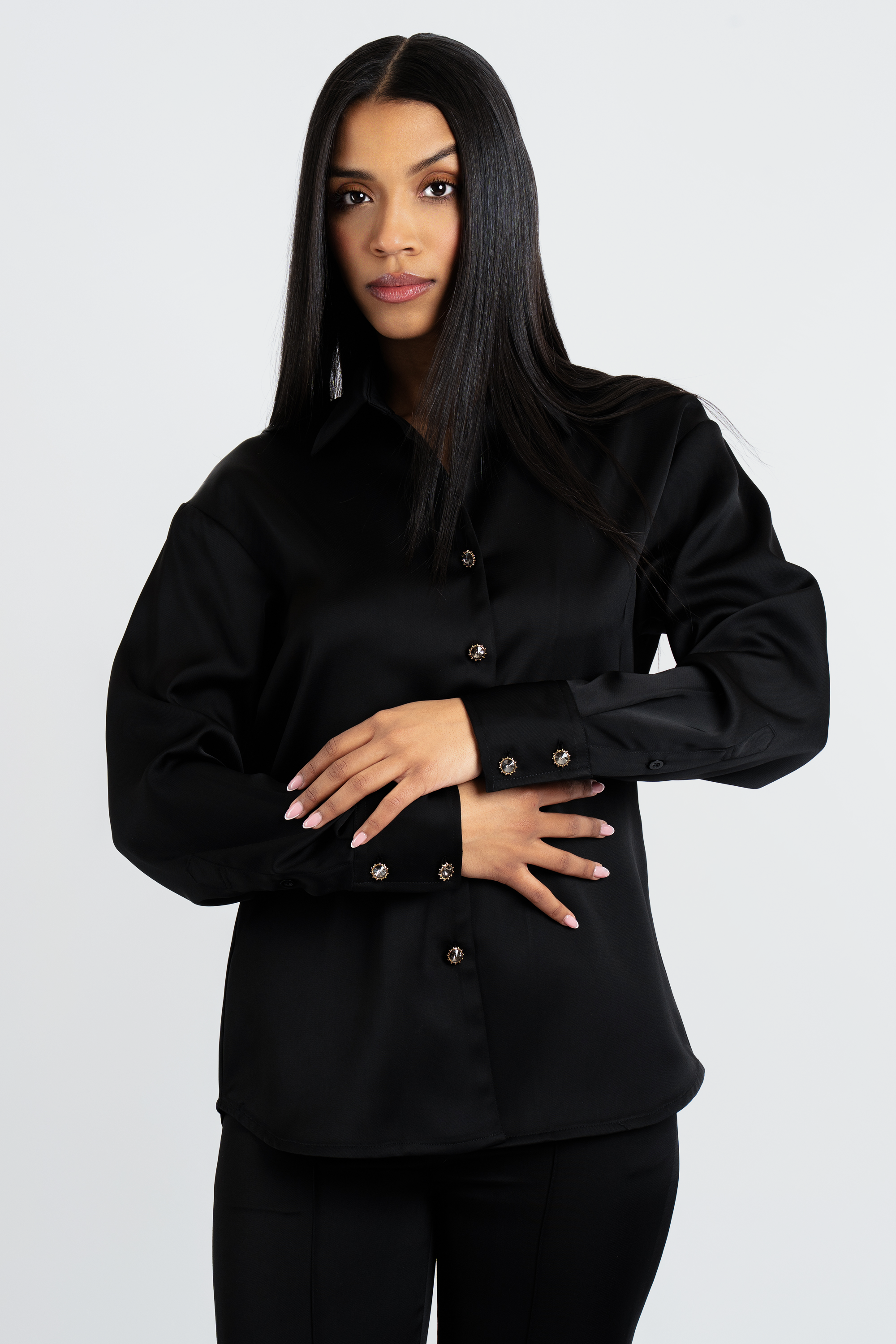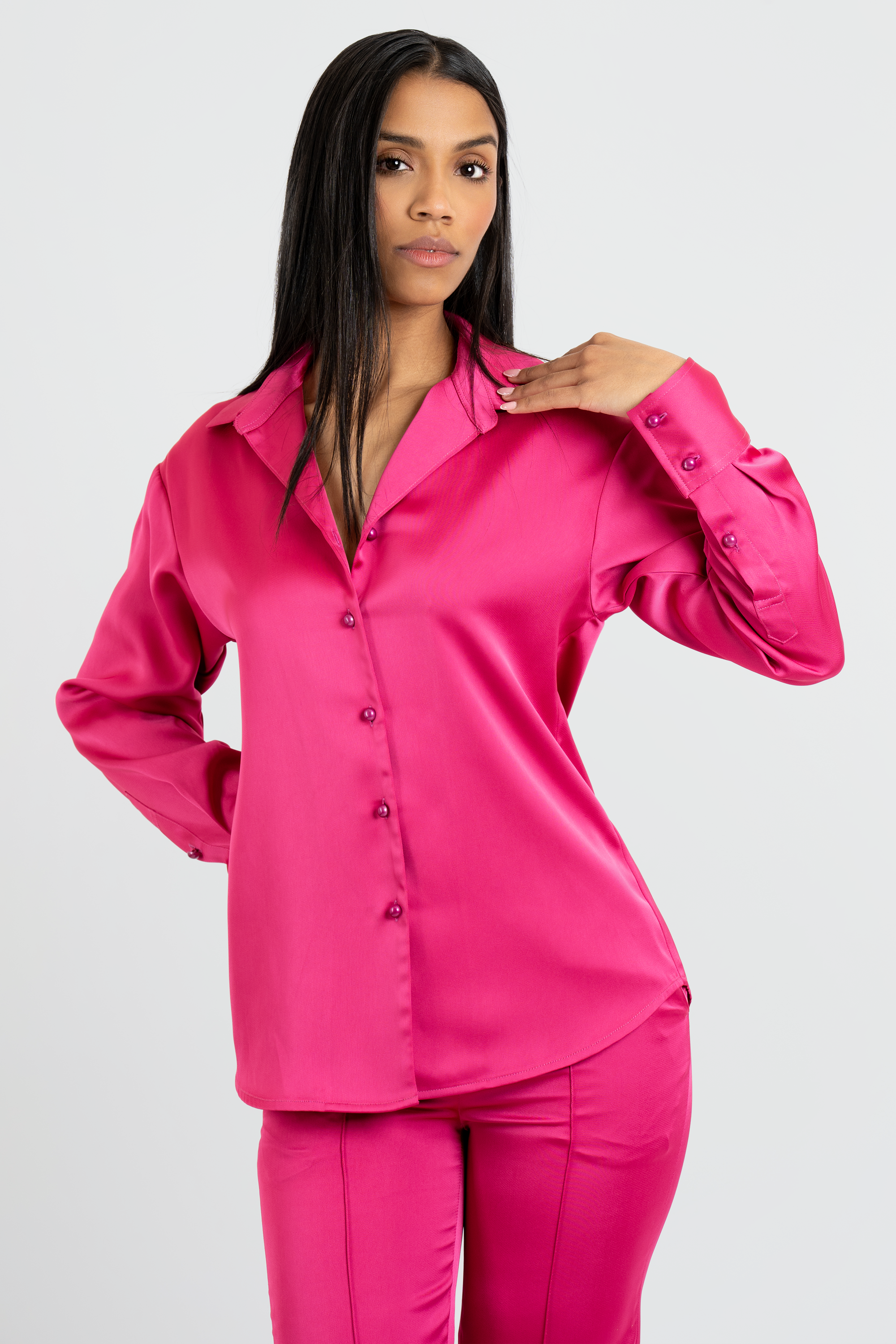 Featuring a sleek, button-down satin shirt with a relaxed fit and matching high-waisted, wide-leg trousers, this ensemble exudes modern elegance. The lustrous fabric offers a luxurious sheen, draping beautifully for a polished yet effortless look. Styled with a printed neck scarf for a touch of Parisian glamour, this set is versatile enough for day-to-night wear.